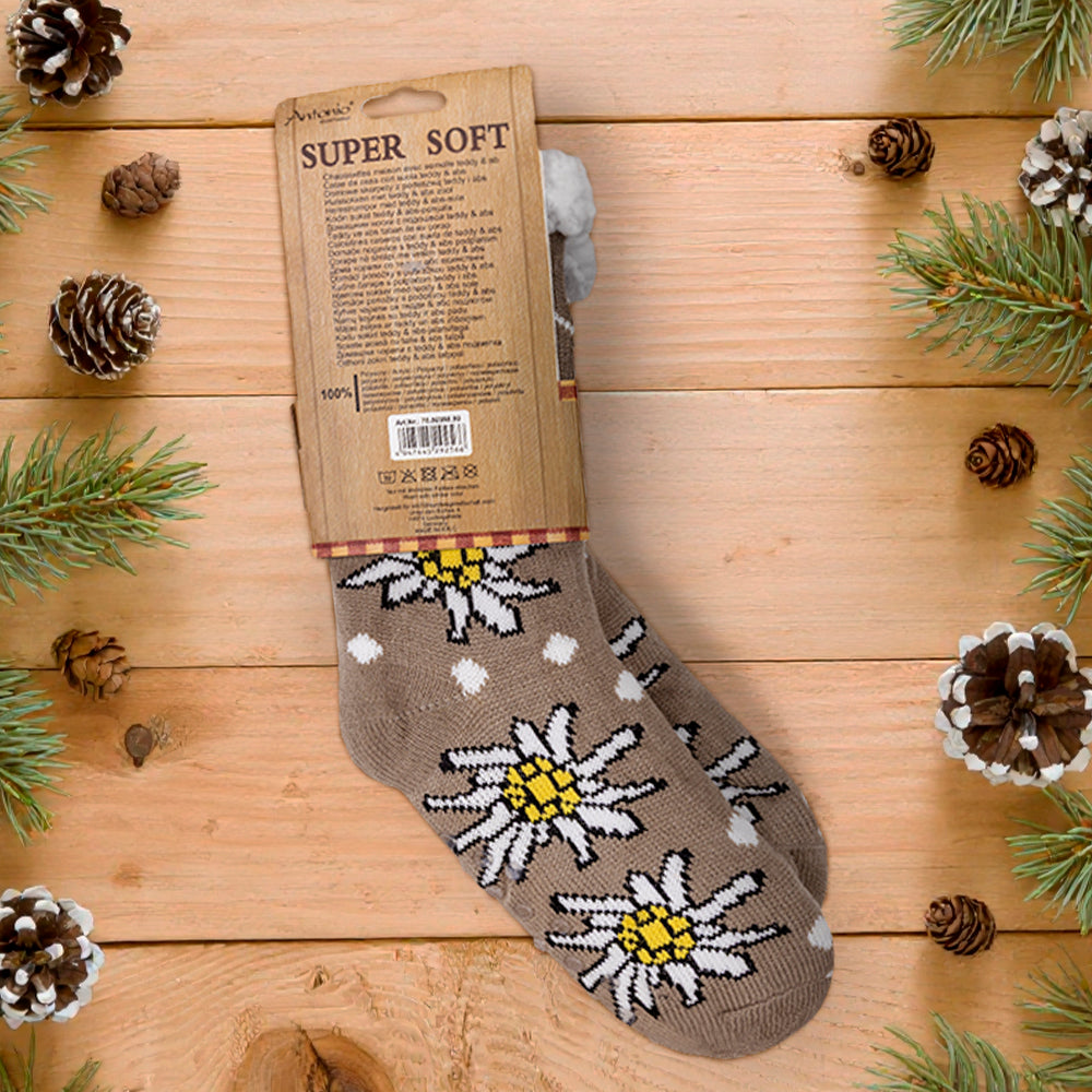 Calze calde e confortevoli con suola antiscivolo. Ideali in casa, garantiscono stabilità, morbidezza e calore nei mesi più freddi. Perfette per un relax quotidiano in perfetto stile altoatesino.