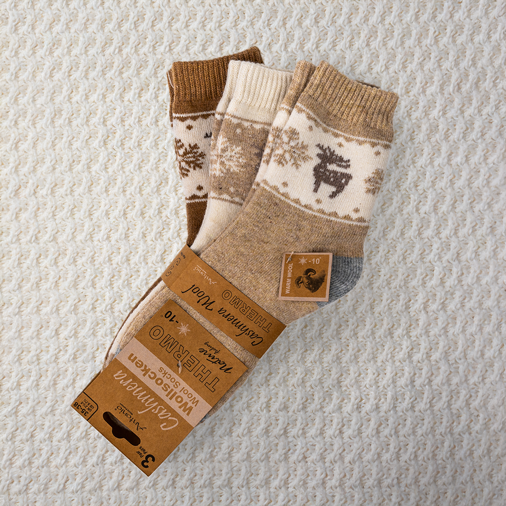 Set di 3 calzini da donna con fantasia renna, morbidi e comodi. Ideali per aggiungere un tocco festoso al quotidiano e/o per un regalo simpatico e utile.